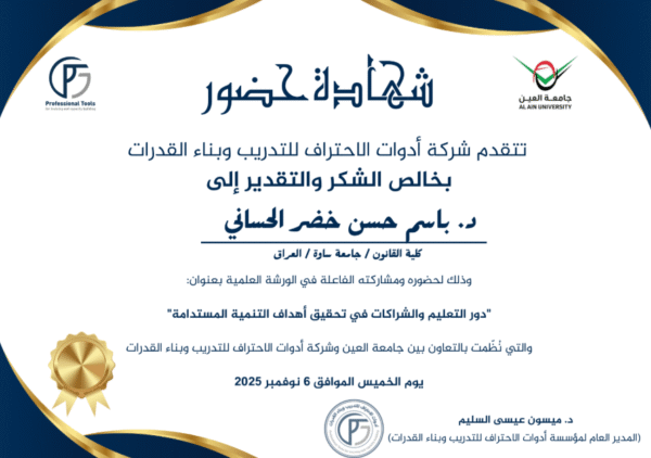 جامعة العين – كلية التربية، بالتعاون مع شركة أدوات الاحتراف للتدريب وبناء القدرات صباح يوم الخميس 6 نوفمبر 2025، ورشة علمية افتراضية بعنوان “دور التعليم والشراكات في تحقيق أهداف التنمية المستدامة”، قدّمتها الدكتورة ميسون عيسى أحمد السليم (ميسون تليلان)، المدير العام لشركة أدوات الاحتراف للتدريب وبناء القدرات.
