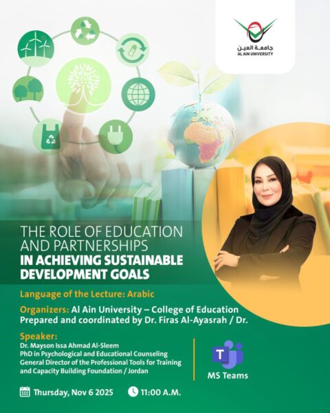 نظّمت جامعة العين – كلية التربية بالتعاون مع شركة أدوات الاحتراف للتدريب وبناء القدرات واتحاد الأكاديميين والعلماء العرب صباح يوم الخميس الموافق 6 نوفمبر 2025 ورشةً علميةً افتراضية بعنوان “دور التعليم والشراكات في تحقيق أهداف التنمية المستدامة”، قدّمتها الدكتورة ميسون عيسى أحمد السليم (ميسون تليلان)، المدير العام لشركة أدوات الاحتراف للتدريب وبناء القدرات.