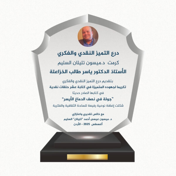 وفي ختام هذه التجربة النقدية الثرية، قدّمت الدكتورة ميسون السليم درع التميّز الفكري إلى الأستاذ الدكتور الخزاعلة، تقديرًا لجهوده الريادية في هذه المبادرة المتميّزة، مؤكّدة أنّ هذه القراءات ستُوثَّق قريبًا في كتيّب مستقل يحمل عنوان: “القراءات النقدية العشر في كتاب جولة في نصف الدماغ الأيسر”.