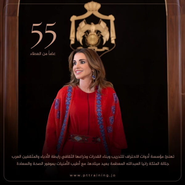 تهنئ مؤسسة أدوات الاحتراف للتدريب وبناء القدرات وذراعها الثقافي رابطة الأدباء والمثقفين العرب جلالة الملكة رانيا العبدالله المعظمة بعيد ميلادها، مع أطيب الأمنيات بموفور الصحة والسعادة