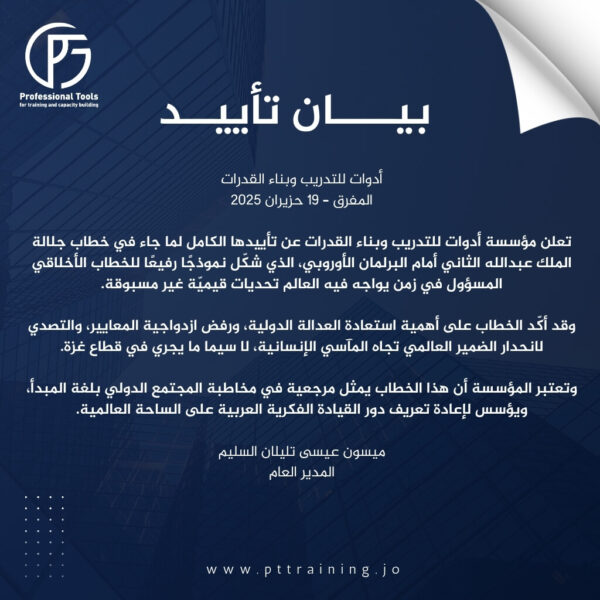 تعلن مؤسسة أدوات للتدريب وبناء القدرات عن تأييدها الكامل لما جاء في خطاب جلالة الملك عبدالله الثاني أمام البرلمان الأوروبي، الذي شكّل نموذجًا رفيعًا للخطاب الأخلاقي المسؤول في زمن يواجه فيه العالم تحديات قيميّة غير مسبوقة.